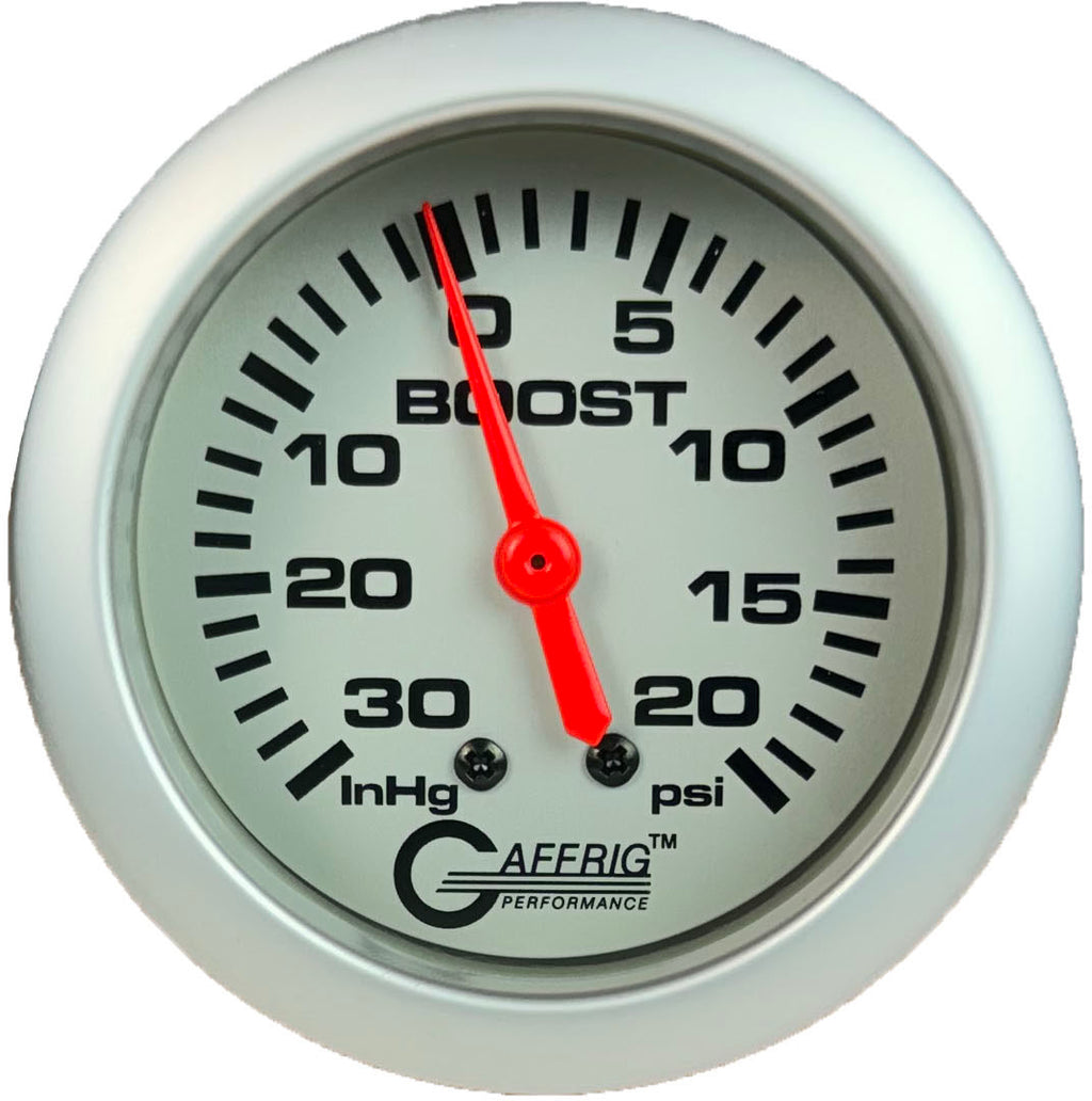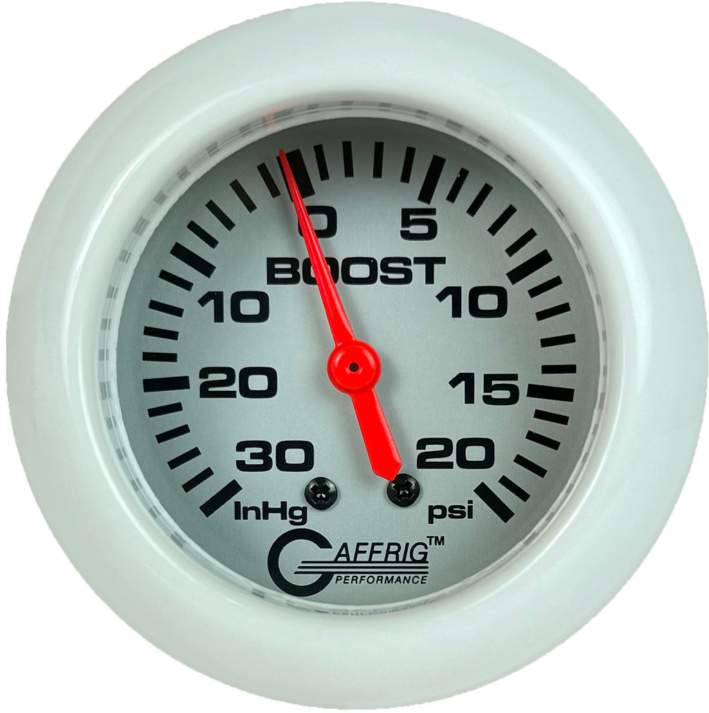 Optimize your engine's performance with Gaffrig Performance’s 2 5/8 Inch Racing Series Mechanical Vacuum/Boost Gauge (0-30 in. Hg / 0-20 PSI). This versatile dual-purpose gauge provides precise vacuum and boost readings, allowing you to monitor both negative and positive pressure in turbocharged, supercharged, or naturally aspirated engines. With a mechanical design that ensures reliable operation without electrical connections, it delivers real-time, accurate data in a sleek, easy-to-read display. Perfect for high-performance racing and automotive applications, this durable gauge gives you the vital information needed to fine-tune your engine for peak performance in any condition.