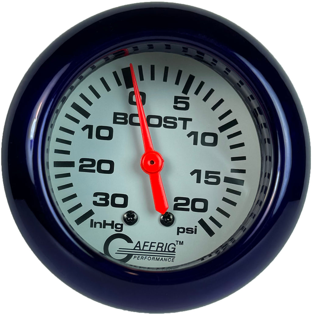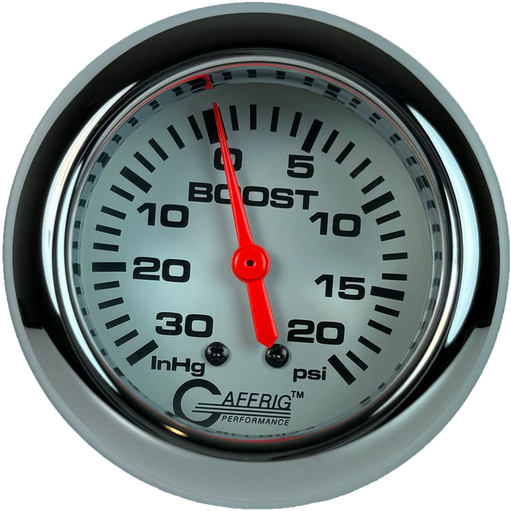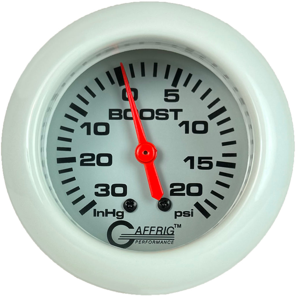 Optimize your engine's performance with Gaffrig Performance’s 2 5/8 Inch Racing Series Mechanical Vacuum/Boost Gauge (0-30 in. Hg / 0-20 PSI). This versatile dual-purpose gauge provides precise vacuum and boost readings, allowing you to monitor both negative and positive pressure in turbocharged, supercharged, or naturally aspirated engines. With a mechanical design that ensures reliable operation without electrical connections, it delivers real-time, accurate data in a sleek, easy-to-read display. Perfect for high-performance racing and automotive applications, this durable gauge gives you the vital information needed to fine-tune your engine for peak performance in any condition.